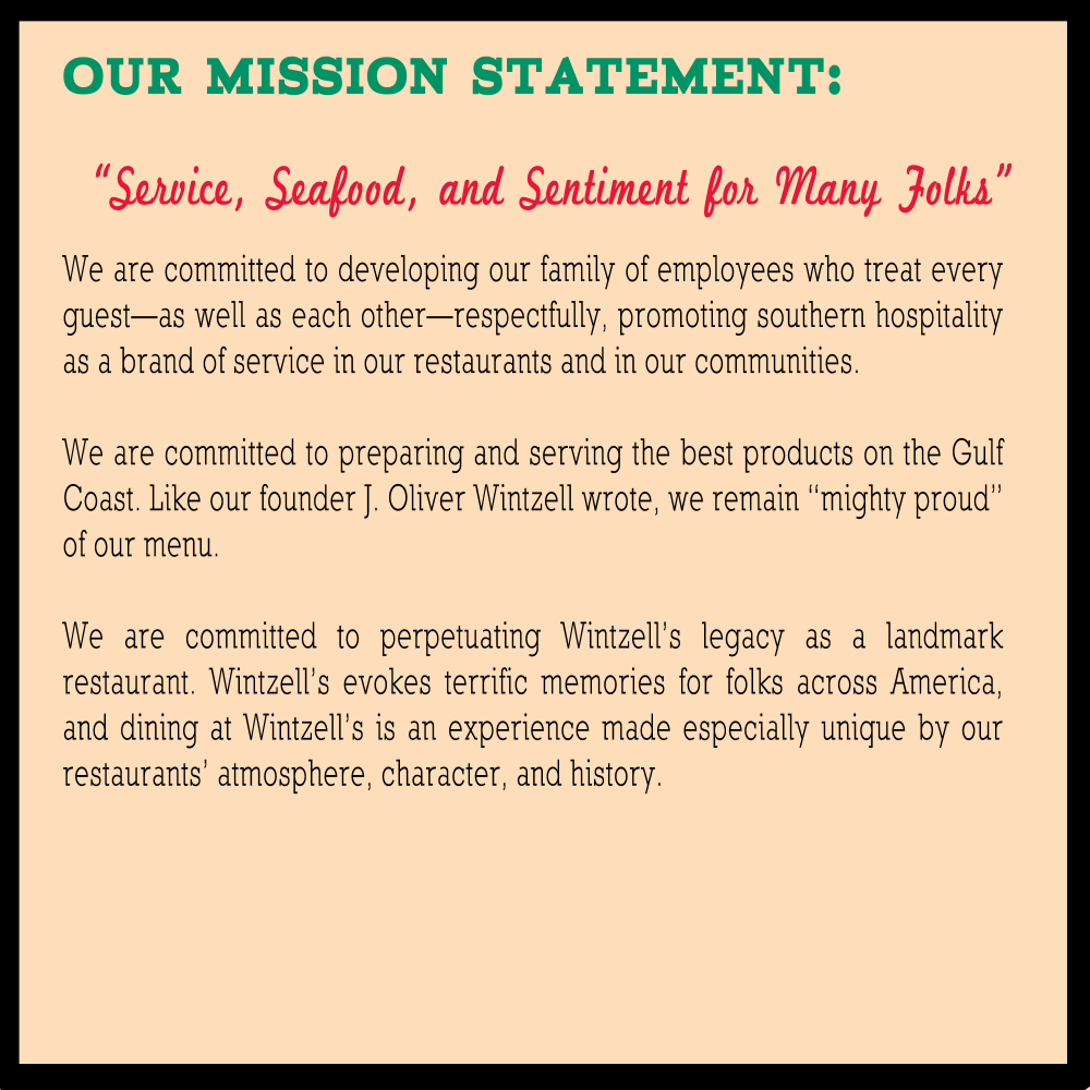 Fried Stewed Nude, Inc. operates Wintzell’s Oyster House in three locations in Mobile County—Historic Downtown Mobile, West Mobile, and Saraland.  Founded in 1938 by J. Oliver Wintzell, Wintzell’s Oyster House is known far and wide for its “oysters—fried, stewed and nude.” What began as a six-stool oyster bar has since grown into a nationally recognized brand featured in such publications as Coastal LivingDelta Sky MagazineGarden and GunSouthern Living, and Willard Scott’s All-American Cookbook. Fried Stewed Nude, Inc. is owned and operated by Bob Omainsky, who holds over twenty five years of restaurant experience.